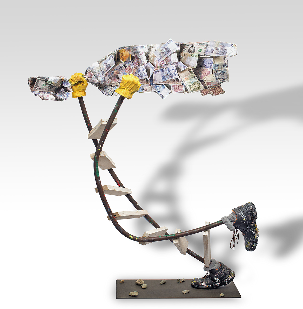 She passed gloating, exploiting the others’ sign. When she realized that the money she was waving like a flag was not hers, but the workers’, she realized she was losing wealth and social status: she was left naked. It was in 1992, in a morning at the end of July, when she decided to flee away in search of a worthy status. Every now and then the figure of a ladder running with a bunch of money in its hand stands out against the setting sun.