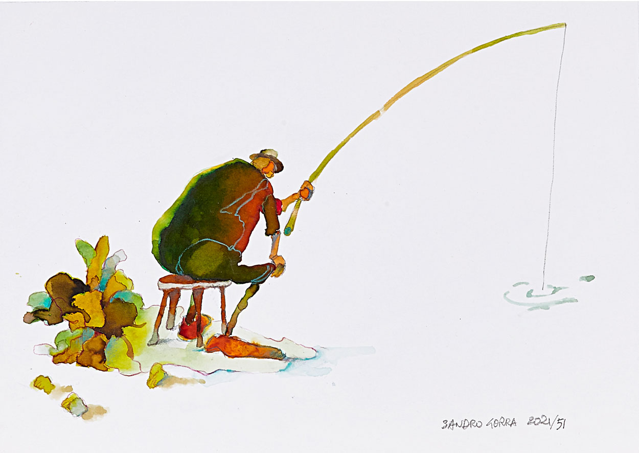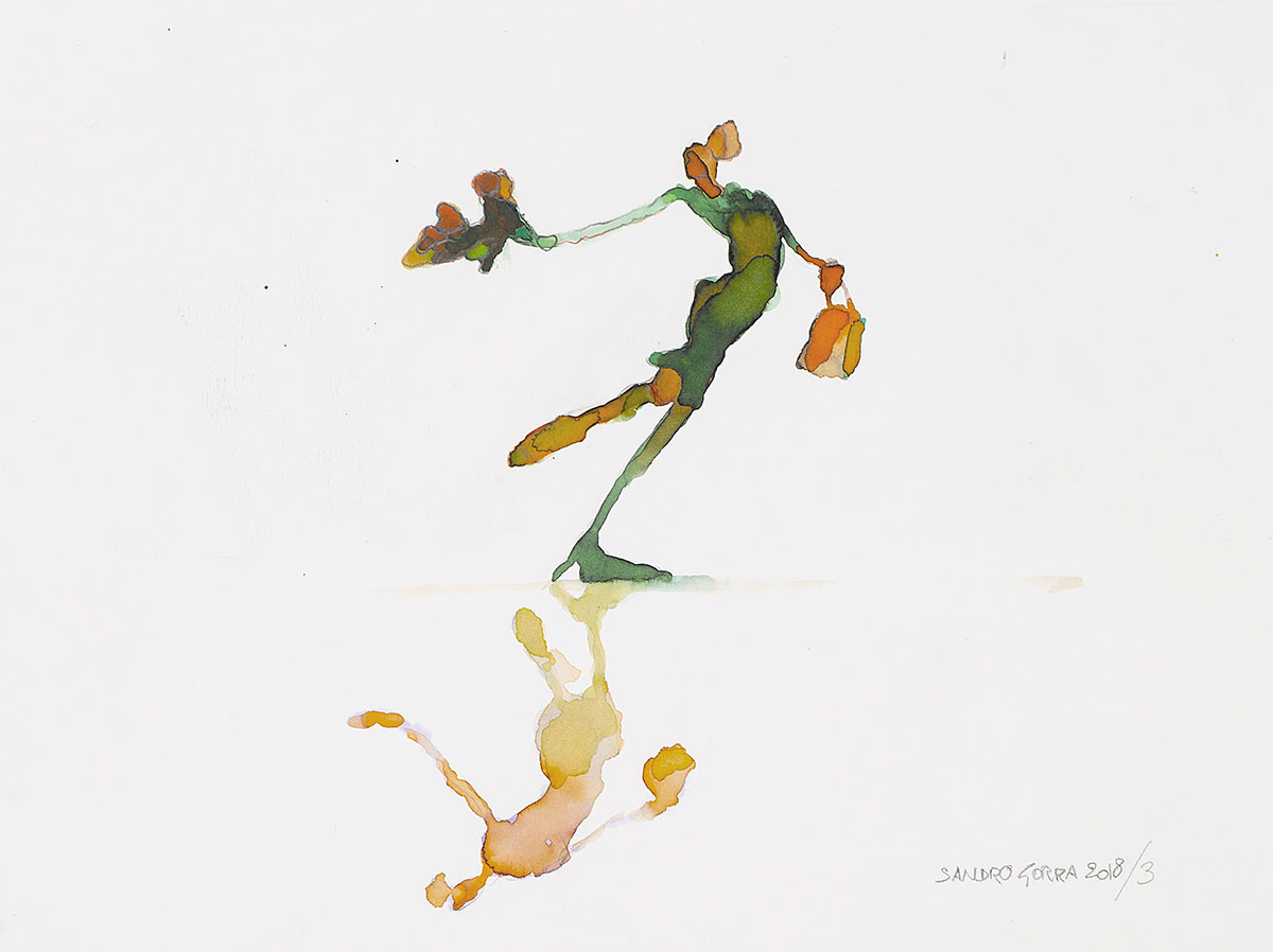 Quando l’attimo quotidiano è davvero la particella elementare più piccola, nascono gli US. L’artista qui è alla ricerca del movimento. L’opera è dipinta con antiche aniline su schoeller superliscio a fondo bagnato. Il colore scivola creando velature vetrose, così il dipinto sembra muoversi. Gorra dice che ci si aspetta di sentire suoni e rumori da un momento all’altro. La pennellata non deve avere il tempo di definirsi. Minuti per dipingerlo, minuta la misura.