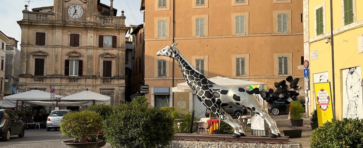 Le giraffe, tra le opere più iconiche di Gorra, dal 23 giugno invadono pacificamente il centro storico e ridisegnano il paesaggio cittadino. Per oltre un mese sculture ad altezza naturale del più sinuoso ed elegante abitante della savana donano un tocco esotico alla città, che “si fa bella” in vista della sessantacinquesima edizione del Festival dei Due Mondi (24 giugno – 10 luglio).