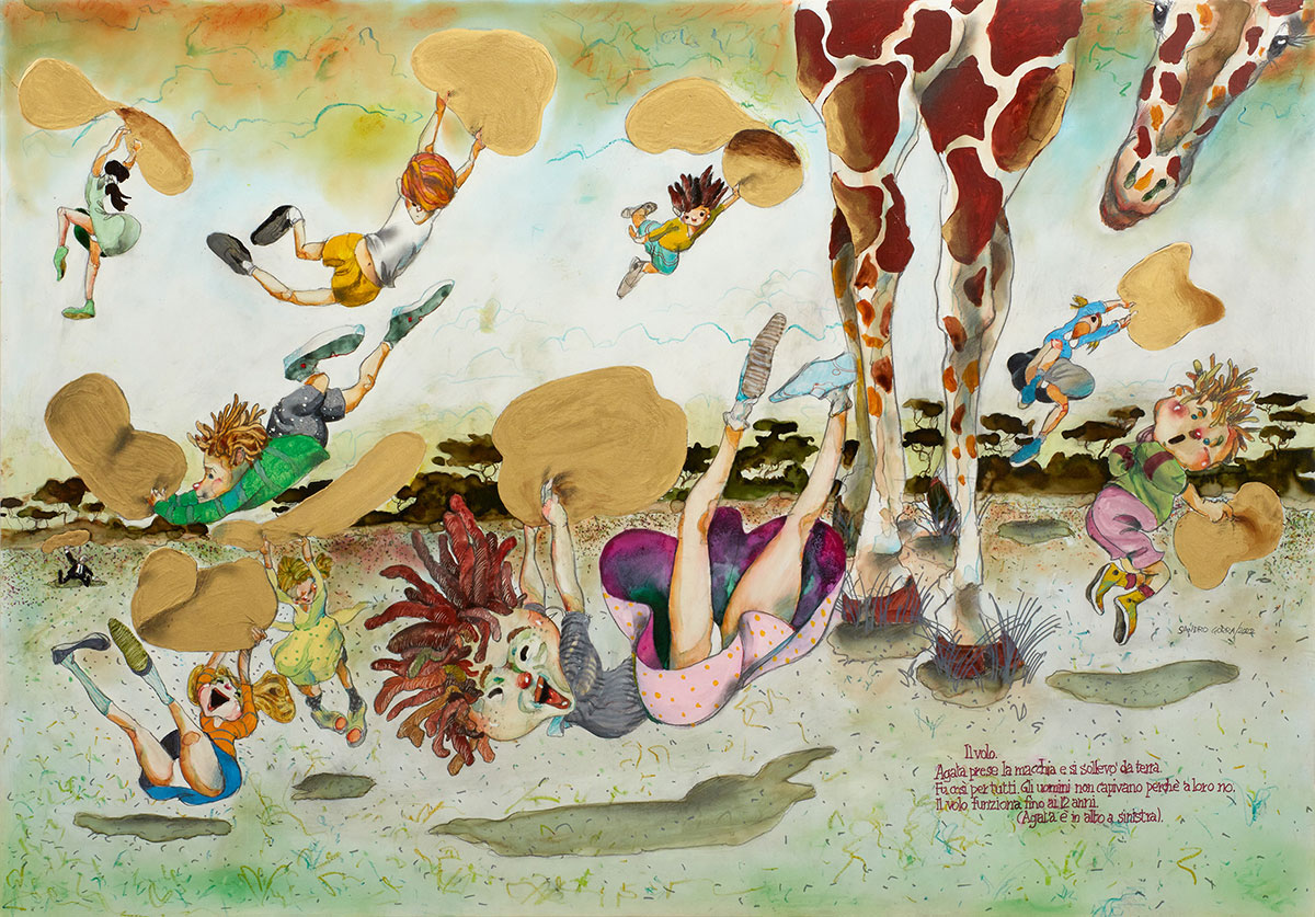 Agata prese la macchia e si sollevò da terra. Fu così per tutti. Gli uomini non capivano perché a loro no. Il volo funziona fino ai 12 anni. (Agata è in alto a sinistra).